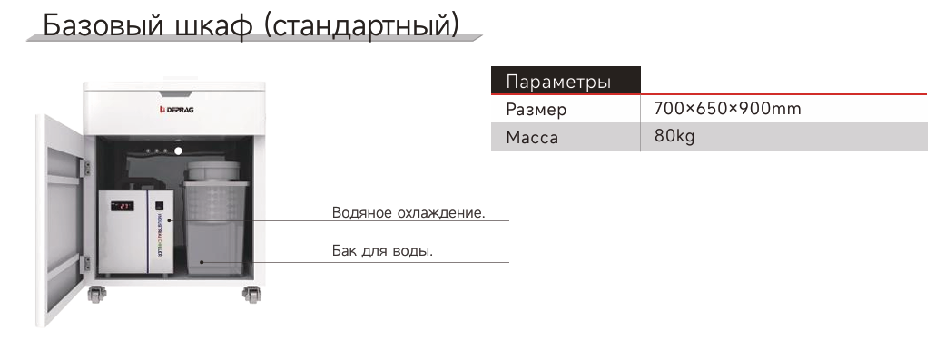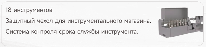 В тумбе интегрированы чиллер (система охлаждения), фильтрующий модуль для очистки охлаждающей жидкости, резервуары для СОЖ (смазочно-охлаждающей жидкости) и воды. Кроме того, в тумбе предусмотрено место для установки вытяжки, которая приобретается отдельно, но является важным элементом для обеспечения безопасной и комфортной работы. Вместе со станком поставляется набор из 25 фрез различной формы, диаметра и покрытия, что позволяет сразу приступить к работе с различными материалами.