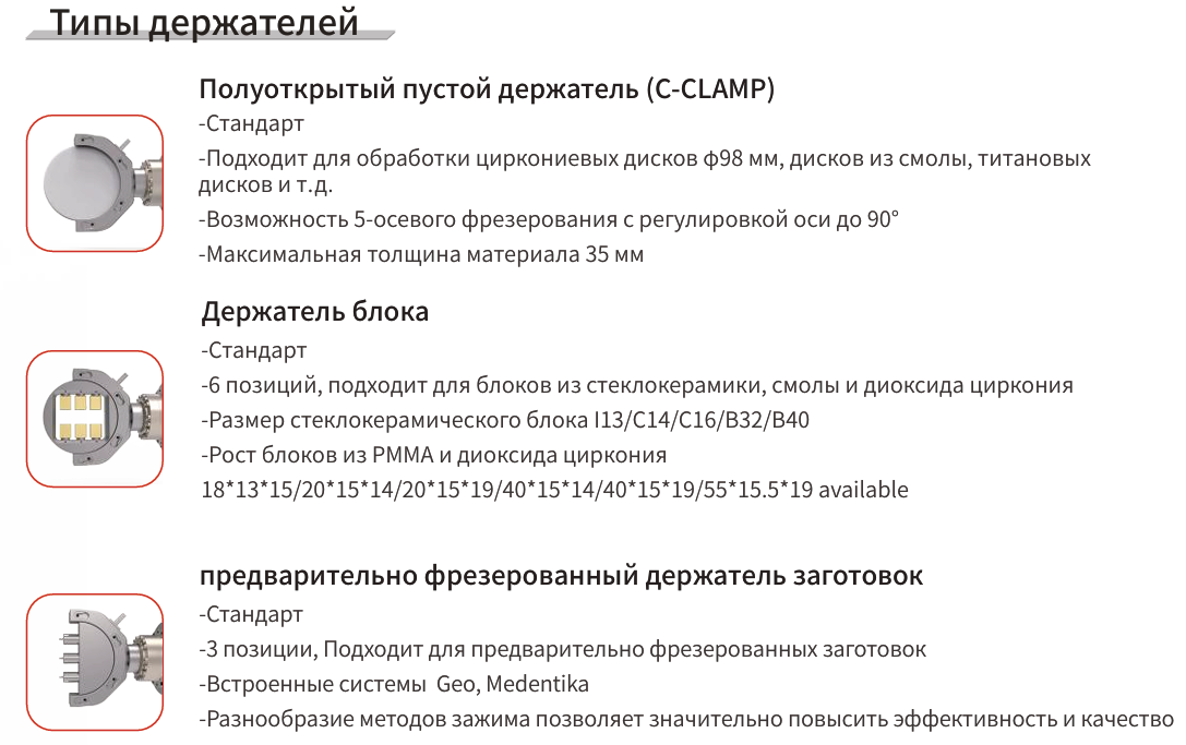 Ключевым преимуществом станка является наличие двух типов держателей (холдеров) фрез. Первый – С-образный или открытый холдер, обеспечивающий 5-осевую обработку с возможностью регулировки оси наклона до 90 градусов. Это позволяет с невероятной точностью обрабатывать фронтальные поверхности, создавая сложные анатомические формы с высочайшей детализацией. Высокая точность позиционирования и плавность хода гарантируют безупречный результат. Второй холдер предназначен для обработки блоков PMMA, циркония и стеклокерамики и имеет 6 позиций для фиксации заготовок, что значительно ускоряет и упрощает рабочий процесс.