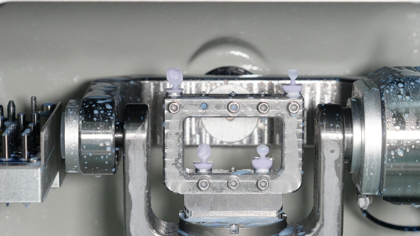 Стабильность · Шпиндель 2,5 кВт Φ62 мм; · Интегрированная литая конструкция напольного крепления; обеспечивает большую прочность и устойчивость; · Опора оси A B из нержавеющей стали, высокая интенсивность; · Профессиональный шпиндель с водяным охлаждением, увеличенный срок службы; · Автоматическая калибровка титановой колонны; · Автоматическая калибровка стеклокерамической колонны; Многофункциональный дизайн · Большой угол поворота: ось A ±360°, ось B ±30°. · Держатель C-CLAMP подходит для обработки циркониевых дисков диаметром 98*35 мм (макс.), · Дисков из полимерных смол, титановых дисков и поддерживает фрезерование под углом 90°. ·8-позиционный держатель блока подходит для стеклокерамики. · 4-позиционный держатель абатмента для предварительной обработки с возможностью обратного зажима, что позволяет избежать механической обработки и шлифования титановых заготовок.