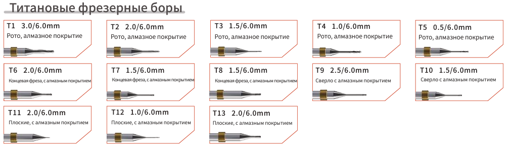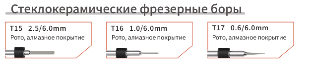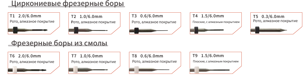 Фрезы Магазин фрез расчитан на 18 позиций, что обеспечит бесперебойную обработку материалов: циркон, PMMA, Титан, Кобальт-хром и стеклокерамику. Комплект включает в себя 25 фрез с диаметром от 0.4 до 3 мм.