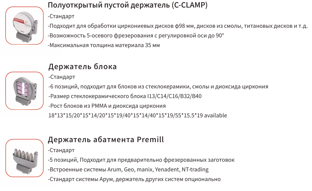 10. Использование специального зонда с точностью 3 микрона, типичного для высокоточной промышленности, подтверждает исключительное качество и надежность DEPRAG W5 MAX. Этот уровень точности позволяет создавать стоматологические изделия высшего качества, соответствующие самым высоким требованиям. Тип холдеров В комплекте к станку Deprag W5 MAX идет 2 вида холдера. С-образный или открытый тип холдера, который позволяет выполнять 5-осевое фрезерование с регулировкой оси до 90 градусов и с высокой точностью прорабатывать фронтальный отдел. И холдер для фрезеровки блоков PMMA, циркона и стеклокерамики с 6 позициями. Опционально можно приобрести холдер для абатментов под Medentica.